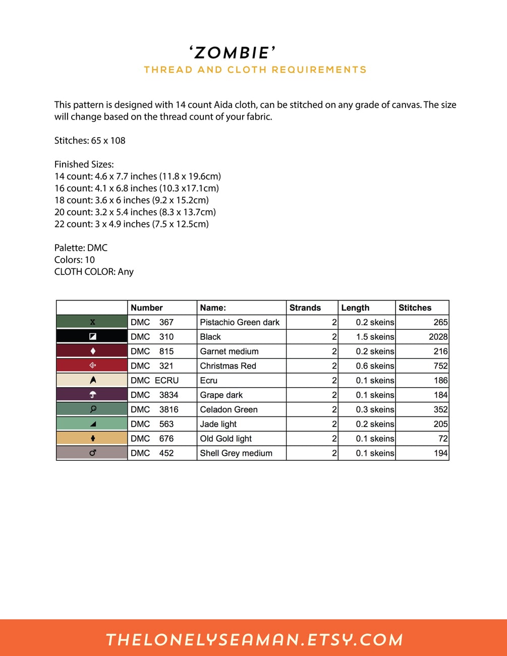 • Thread chart with symbol key, thread lengths etc